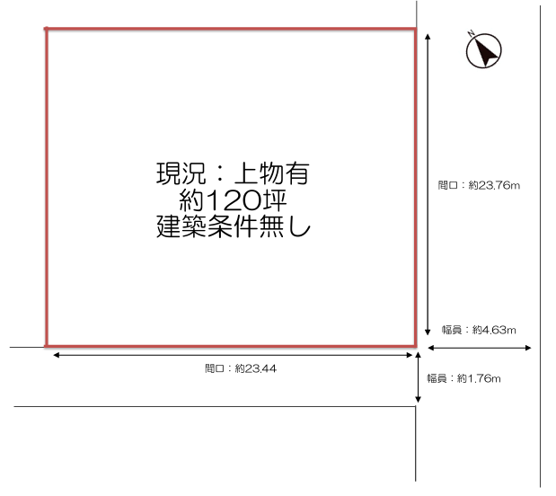接道 | 南東側幅 約4.6m 間口 約23.76m 南西側幅 約1.7m 間口 約23.44m |