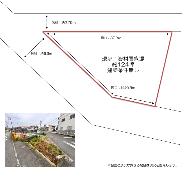 接道は南西側に幅員約6.3mの公道が広く面し、間口も約37.8mと開放的。日当たりや車両の出入りがしやすく、住宅用地としてはもちろん、準工業地域の特性を活かした事業用地としても検討できます。また、北側にも幅員約2.79mの道路があり、角地的な利便性も備えています。